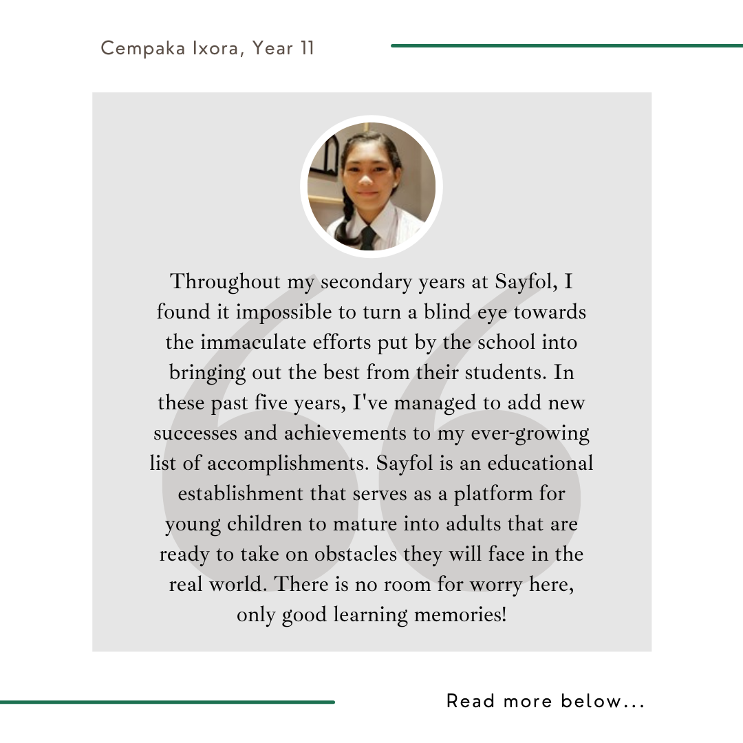 Throughout my secondary years at Sayfol, I found it impossible to turn a blind eye towards the immaculate efforts put by the school into bringing out the best from their students. In these past five years, I've managed to add new successes and achievements to my ever-growing list of accomplishments. I've had the opportunity to host countless private and public events as the emcee, won "Sports Girl of The Year" three times since I first joined, participated in several global scientific and mathematical quizzes, been awarded certificates for top scorer in the grade, and last but not least, my biggest achievement yet – becoming Head Prefect. Academically, I excelled in all of my subjects, showing massive improvement every semester. All of this was made possible by our teachers. Their perseverance towards creating a brighter future for the world is made evident through their teaching, which never fails to encourage their students to reach for the stars. Sayfol is an educational establishment that serves as a platform for young children to mature into adults that are ready to take on obstacles they will face in the real world. There is no room for worry here, only fun and learning!
