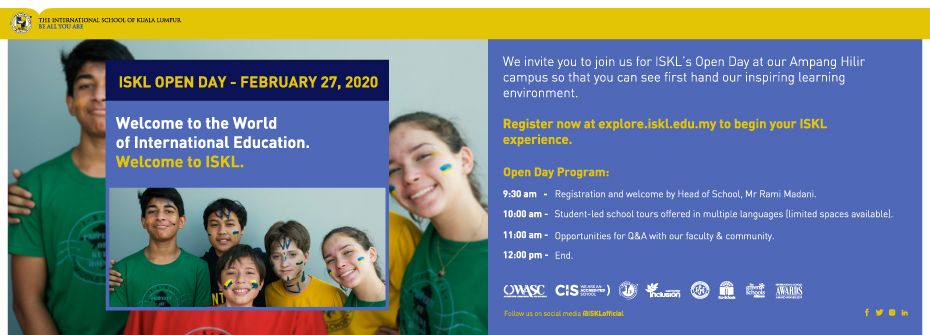 ISKL will be holding an Open Day on Thursday, February 27, 2020 for parents who would like to find out more how ISKL’s approach will prepare their child for the future. It’s a great chance to tour the state-of-the-art Ampang Hilir campus, hear from the Head of School, Mr. Rami Madani, and meet with teachers and parents for a Q&A session. Student-led tours will be available in Japanese, Korean, and Mandarin (limited spaces) as well as English. Register at explore.iskl.edu.my