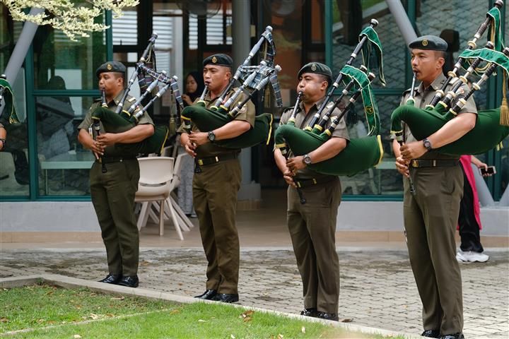 At lunchtime, the senior school students enjoyed a mini cultural festival, hosted and organized by the Upper Years Council. This included cultural dances and singing performed by senior school students. Both the Junior and Senior School students were entertained by a Nepali dance troupe wearing colourful traditional costumes, from Hornbill School. In addition, the RBAF Pipe band marched and played several pieces of music. They drew great applause with the skill of their music and also the skill of the Drum Major throwing the baton. Both acts gave a fantastic performance and Jerudong International School is extremely grateful to both for joining us today to celebrate International Day.
