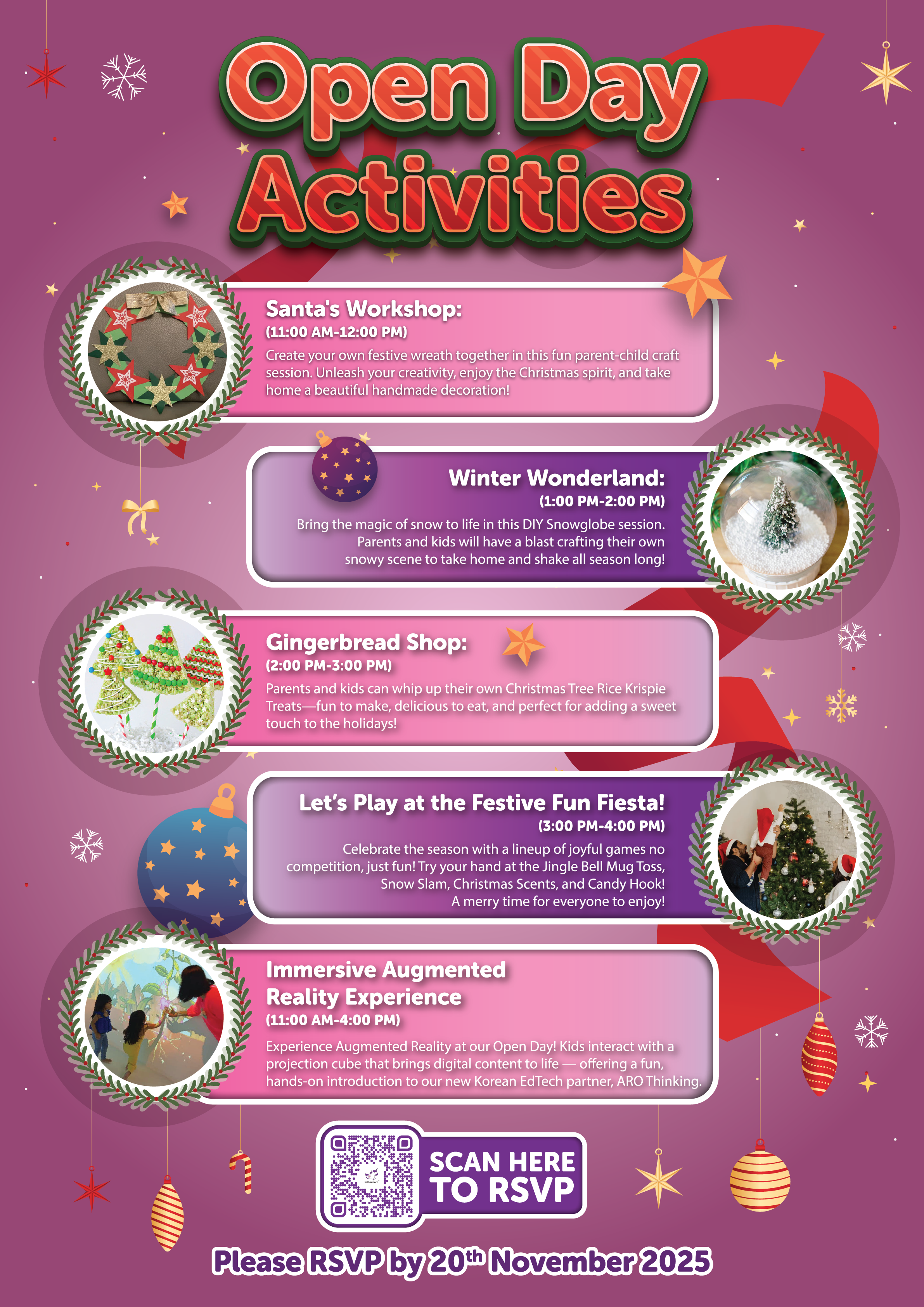 From creating your own Christmas wreath at Santa’s Workshop, crafting a snowy scene in Winter Wonderland, decorating sweet treats at our Gingerbread Shop, playing joyful holiday games at the Festive Fun Fiesta, to exploring our Immersive Augmented Reality Experience — there’s holiday magic waiting for everyone! ❄️🎁