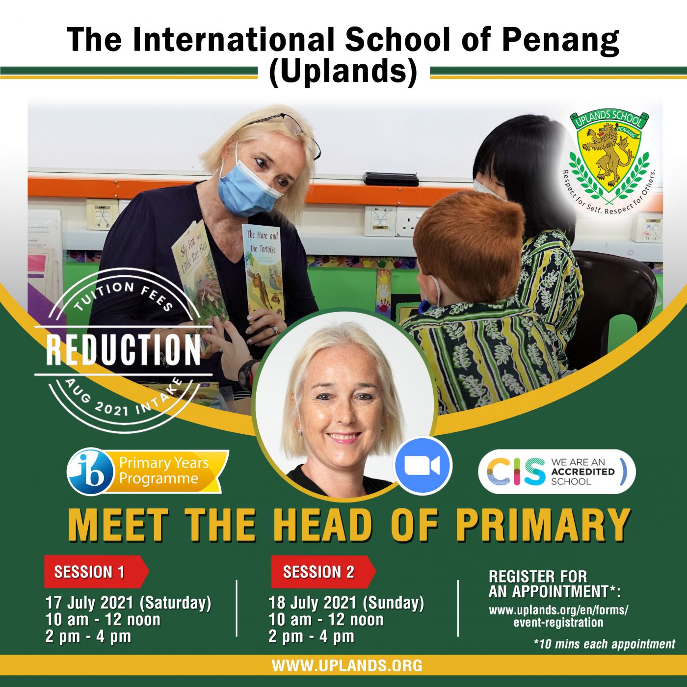 This is an opportunity for prospective Primary parents to meet our Head of Primary, Jacqueline North, and have a personal conversation with her about your child/ren, asking any questions you may have about enrolling at Uplands Primary (age 4 to 11 years old) and joining the Uplands community. If you would like to find out more about The International School of Penang (Uplands) and would like to arrange a 10-minute conversation with our Head of Primary, please book in a time via the link below. We look forward to hearing from you and meeting you soon.