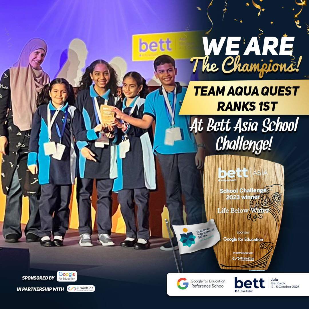 Aqua Quest, Our victorious team representing Spectrum International School at the Bett Asia Challenge held in Bangkok, Thailand, presented a groundbreaking project named AI Seabin focused on 'Life below Water' (SDG 14). Using the United Nations Sustainable Development Goals (SDGs), the winning team promoted the sustainable use of oceans and marine resources. They're not just winners; they're ocean heroes shaping a sustainable future!