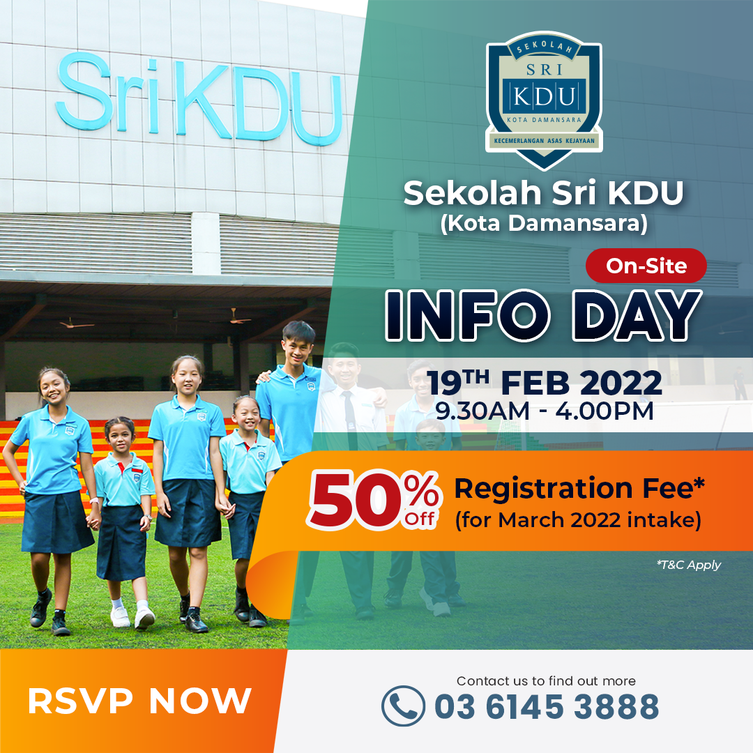 Enjoy 50% off the Registration Fee when you register your child during the Sekolah Sri KDU (Kota Damansara) Info Day. Applicable for March 2022 intake enrolments with terms and conditions applied.