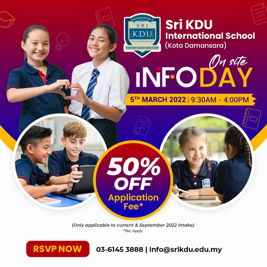 Enjoy 50% off the Application Fee when you register your child during the Sri KDU International School (Kota Damansara) Info Day. Applicable for current and September 2022 intake enrolments with terms and conditions applied.