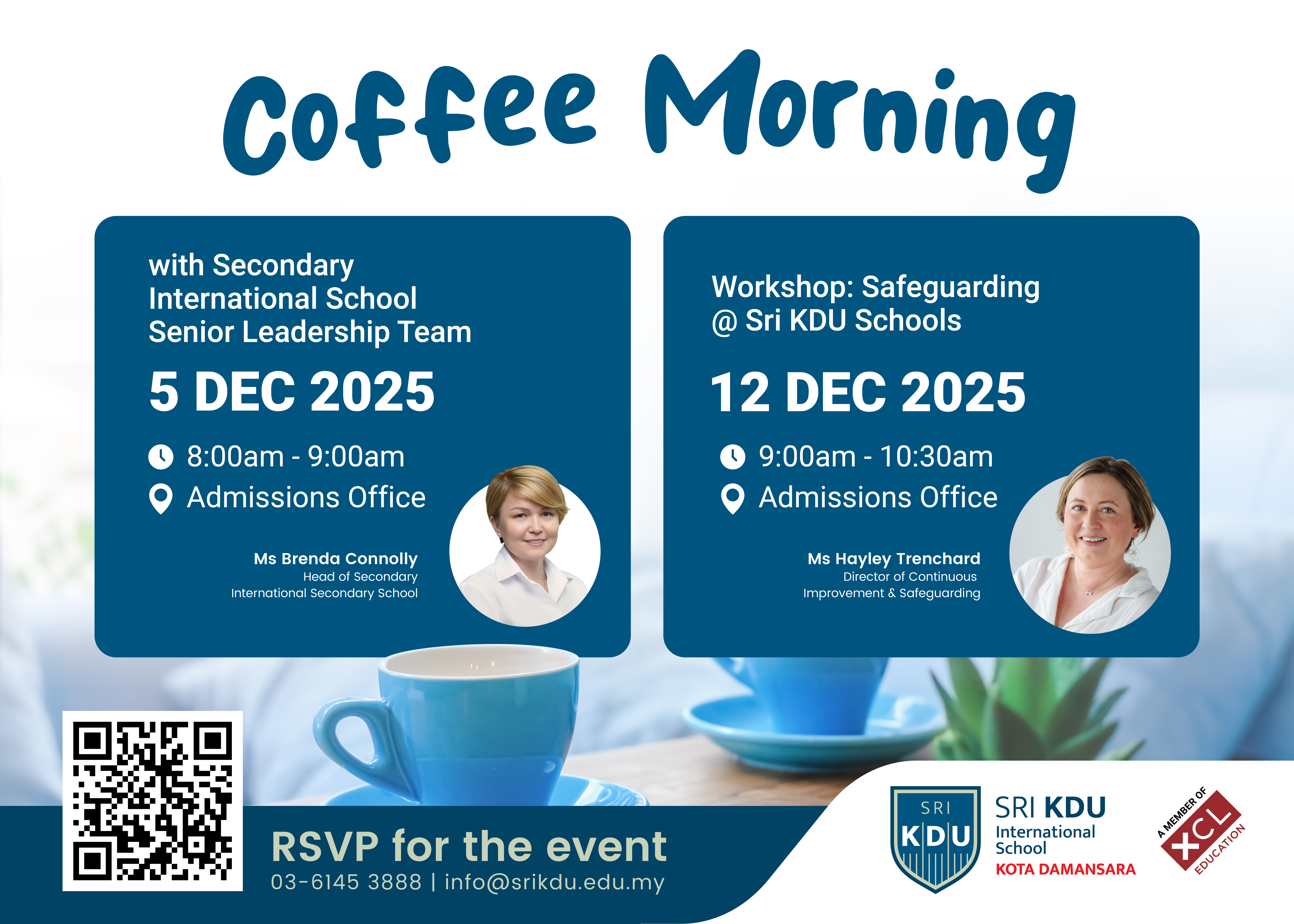 | 📅 Date: Friday, 5 December 2025 🕧 Time: 8:00am – 9:00am 📍Venue: Sri KDU Schools Kota Damansara (Admission Office) | 📅 Date: Friday, 12 December 2025 🕧 Time: 9:00am – 10:30am 📍Speaker: Ms Hayley Trenchard, Director of Continuous Improvement & Safeguarding of XCL Education Malaysia Venue: Sri KDU Schools Kota Damansara (Admission Office) |