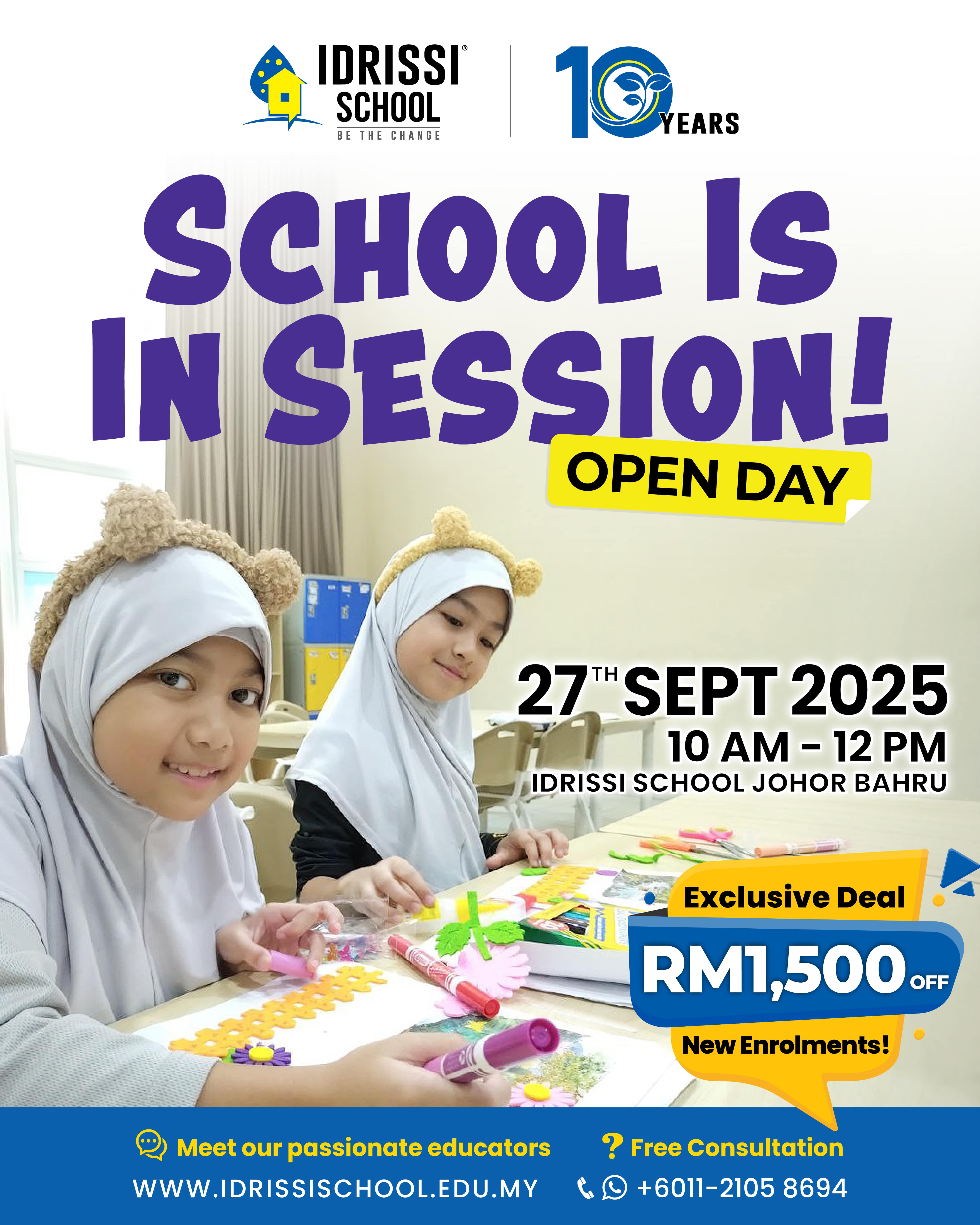 Discover what makes IDRISSI International School unique! Join us on Saturday, 27th September 2025, 10 AM – 12 PM at our Johor Bahru campus.