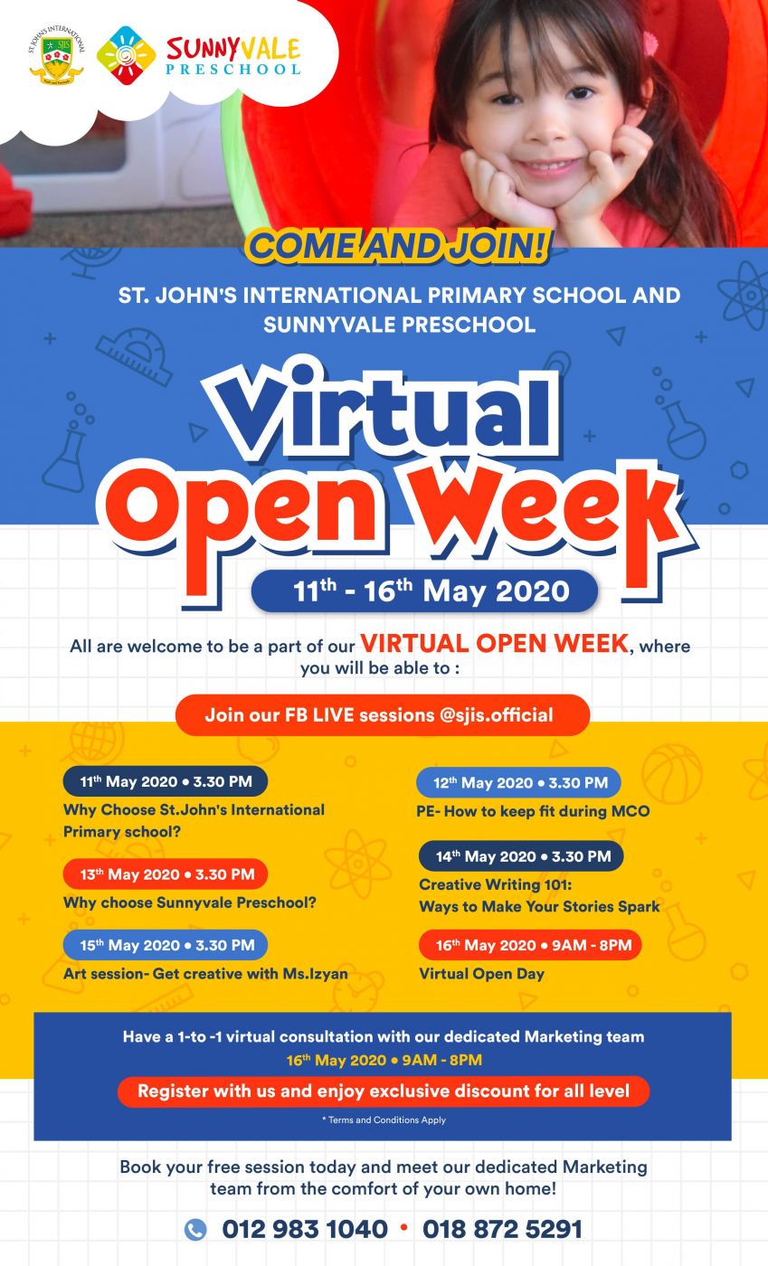 Discover endless opportunities for a brighter future right at your fingertips from home. All are welcome to be a part of St. John’s International Primary School Virtual Open Week from 11th to 16th May 2020, where you will be able to Join our FB LIVE sessions @sjis.official